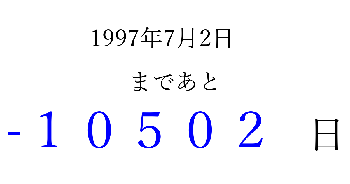 1997年7月2日(水)は もう 00000 日過ぎました 追加すると、トップページからすぐ選べるようになります ※2026/04/03現在の結果です。 最新の状態に更新する ↓シェアして、タイムライン上にカウントダウンを表示しよう!↓ 📤 この結果を共有する Tweet シェア Threads Bluesky 別の日付でカウントダウン 1997年7月のカレンダー このページをブックマークに追加すると、いつでもカウントダウンを確認できます。 (PC: Ctrl+D / Mac: ⌘+D) hitome-notes.comでは以下のページも運営しています。 指定日と期間から日付を計算 | ガチャ確率計算・シミュレーション | プライバシー・ポリシー 運営者:Avocado