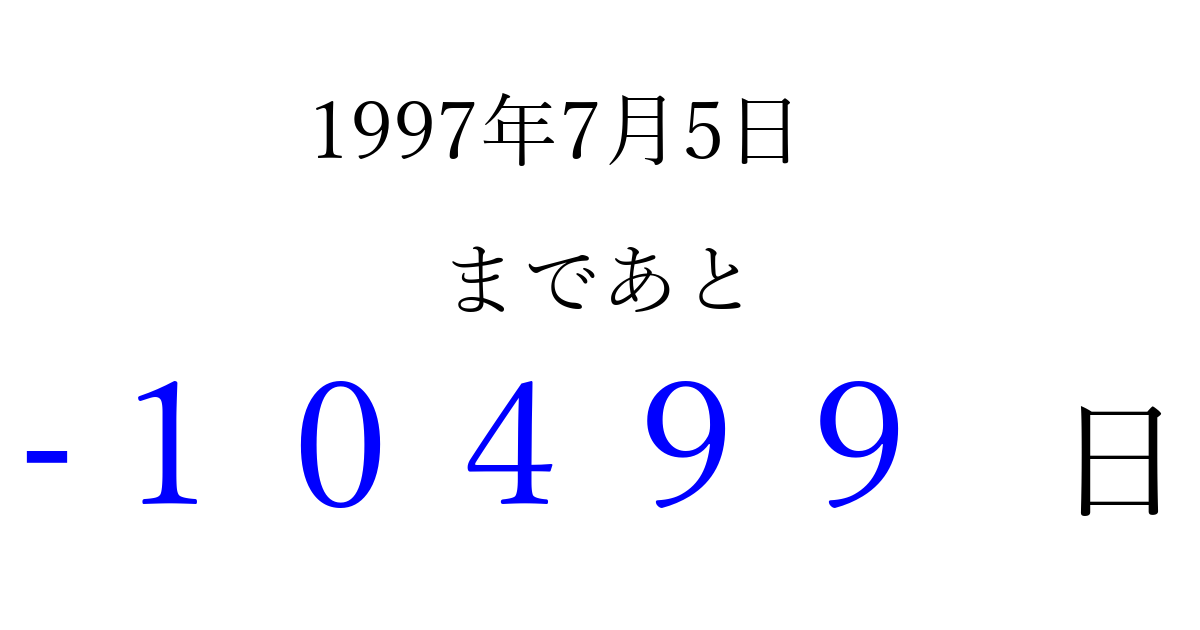 1997年7月5日(土)は もう 00000 日過ぎました 追加すると、トップページからすぐ選べるようになります ※2026/04/03現在の結果です。 最新の状態に更新する ↓シェアして、タイムライン上にカウントダウンを表示しよう!↓ 📤 この結果を共有する Tweet シェア Threads Bluesky 別の日付でカウントダウン 1997年7月のカレンダー このページをブックマークに追加すると、いつでもカウントダウンを確認できます。 (PC: Ctrl+D / Mac: ⌘+D) hitome-notes.comでは以下のページも運営しています。 指定日と期間から日付を計算 | ガチャ確率計算・シミュレーション | プライバシー・ポリシー 運営者:Avocado