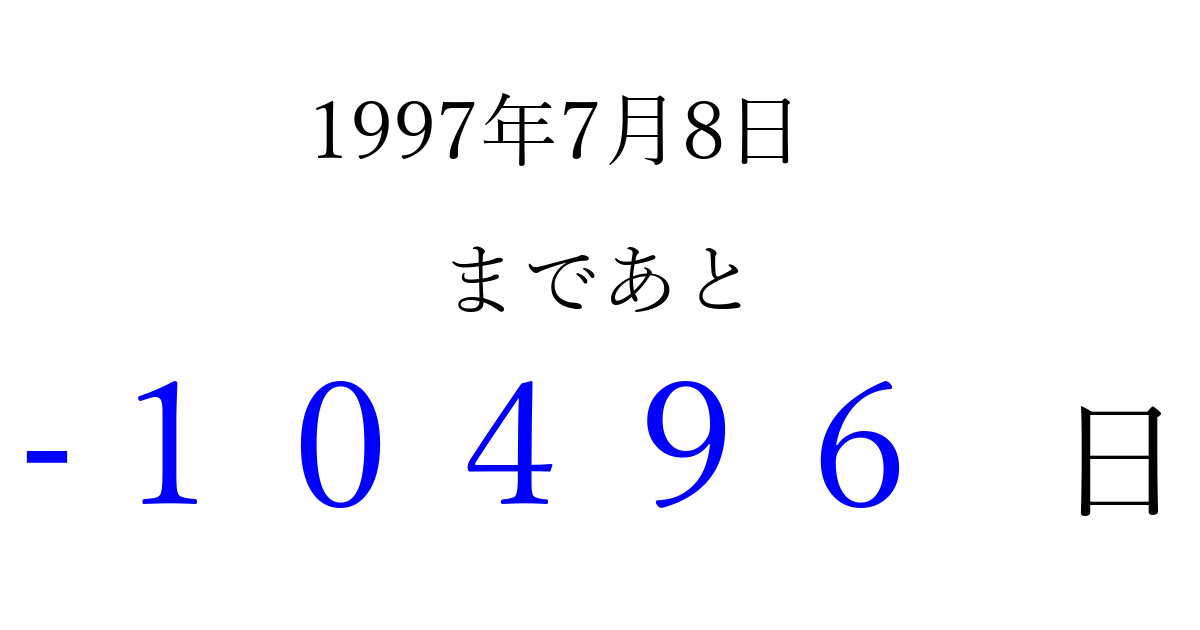 1997年7月8日(火)は もう 00000 日過ぎました 追加すると、トップページからすぐ選べるようになります ※2026/04/03現在の結果です。 最新の状態に更新する ↓シェアして、タイムライン上にカウントダウンを表示しよう!↓ 📤 この結果を共有する Tweet シェア Threads Bluesky 別の日付でカウントダウン 1997年7月のカレンダー このページをブックマークに追加すると、いつでもカウントダウンを確認できます。 (PC: Ctrl+D / Mac: ⌘+D) hitome-notes.comでは以下のページも運営しています。 指定日と期間から日付を計算 | ガチャ確率計算・シミュレーション | プライバシー・ポリシー 運営者:Avocado