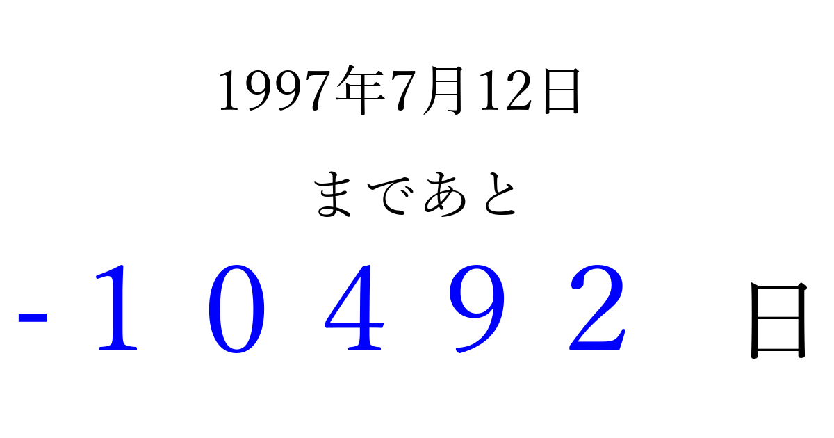 1997年7月12日(土)は もう 00000 日過ぎました 追加すると、トップページからすぐ選べるようになります ※2026/04/03現在の結果です。 最新の状態に更新する ↓シェアして、タイムライン上にカウントダウンを表示しよう!↓ 📤 この結果を共有する Tweet シェア Threads Bluesky 別の日付でカウントダウン 1997年7月のカレンダー このページをブックマークに追加すると、いつでもカウントダウンを確認できます。 (PC: Ctrl+D / Mac: ⌘+D) hitome-notes.comでは以下のページも運営しています。 指定日と期間から日付を計算 | ガチャ確率計算・シミュレーション | プライバシー・ポリシー 運営者:Avocado