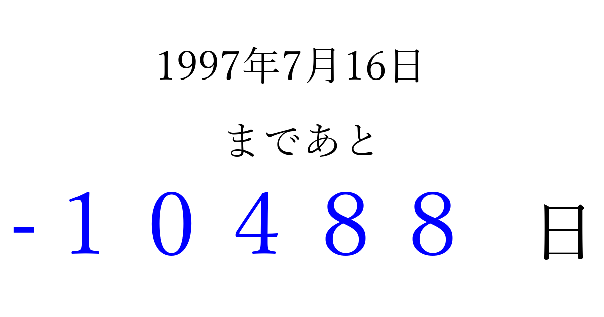 1997年7月16日(水)は もう 00000 日過ぎました 追加すると、トップページからすぐ選べるようになります ※2026/04/03現在の結果です。 最新の状態に更新する ↓シェアして、タイムライン上にカウントダウンを表示しよう!↓ 📤 この結果を共有する Tweet シェア Threads Bluesky 別の日付でカウントダウン 1997年7月のカレンダー このページをブックマークに追加すると、いつでもカウントダウンを確認できます。 (PC: Ctrl+D / Mac: ⌘+D) hitome-notes.comでは以下のページも運営しています。 指定日と期間から日付を計算 | ガチャ確率計算・シミュレーション | プライバシー・ポリシー 運営者:Avocado
