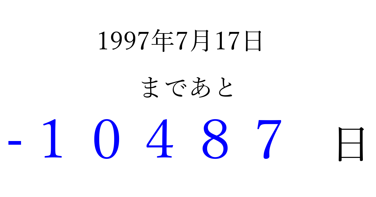 1997年7月17日(木)は もう 00000 日過ぎました 追加すると、トップページからすぐ選べるようになります ※2026/04/03現在の結果です。 最新の状態に更新する ↓シェアして、タイムライン上にカウントダウンを表示しよう!↓ 📤 この結果を共有する Tweet シェア Threads Bluesky 別の日付でカウントダウン 1997年7月のカレンダー このページをブックマークに追加すると、いつでもカウントダウンを確認できます。 (PC: Ctrl+D / Mac: ⌘+D) hitome-notes.comでは以下のページも運営しています。 指定日と期間から日付を計算 | ガチャ確率計算・シミュレーション | プライバシー・ポリシー 運営者:Avocado