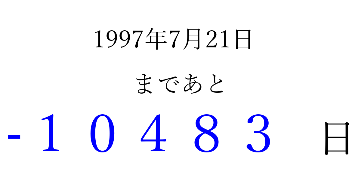 1997年7月21日(月)は もう 00000 日過ぎました 追加すると、トップページからすぐ選べるようになります ※2026/04/03現在の結果です。 最新の状態に更新する ↓シェアして、タイムライン上にカウントダウンを表示しよう!↓ 📤 この結果を共有する Tweet シェア Threads Bluesky 別の日付でカウントダウン 1997年7月のカレンダー このページをブックマークに追加すると、いつでもカウントダウンを確認できます。 (PC: Ctrl+D / Mac: ⌘+D) hitome-notes.comでは以下のページも運営しています。 指定日と期間から日付を計算 | ガチャ確率計算・シミュレーション | プライバシー・ポリシー 運営者:Avocado