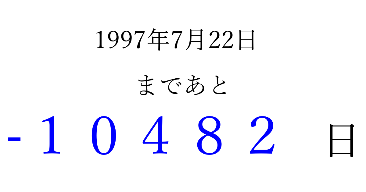 1997年7月22日(火)は もう 00000 日過ぎました 追加すると、トップページからすぐ選べるようになります ※2026/04/03現在の結果です。 最新の状態に更新する ↓シェアして、タイムライン上にカウントダウンを表示しよう!↓ 📤 この結果を共有する Tweet シェア Threads Bluesky 別の日付でカウントダウン 1997年7月のカレンダー このページをブックマークに追加すると、いつでもカウントダウンを確認できます。 (PC: Ctrl+D / Mac: ⌘+D) hitome-notes.comでは以下のページも運営しています。 指定日と期間から日付を計算 | ガチャ確率計算・シミュレーション | プライバシー・ポリシー 運営者:Avocado