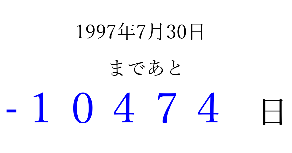 1997年7月30日(水)は もう 00000 日過ぎました 追加すると、トップページからすぐ選べるようになります ※2026/04/03現在の結果です。 最新の状態に更新する ↓シェアして、タイムライン上にカウントダウンを表示しよう!↓ 📤 この結果を共有する Tweet シェア Threads Bluesky 別の日付でカウントダウン 1997年7月のカレンダー このページをブックマークに追加すると、いつでもカウントダウンを確認できます。 (PC: Ctrl+D / Mac: ⌘+D) hitome-notes.comでは以下のページも運営しています。 指定日と期間から日付を計算 | ガチャ確率計算・シミュレーション | プライバシー・ポリシー 運営者:Avocado