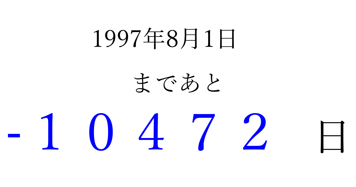 1997年8月1日(金)は もう 00000 日過ぎました 追加すると、トップページからすぐ選べるようになります ※2026/04/03現在の結果です。 最新の状態に更新する ↓シェアして、タイムライン上にカウントダウンを表示しよう!↓ 📤 この結果を共有する Tweet シェア Threads Bluesky 別の日付でカウントダウン 1997年8月のカレンダー このページをブックマークに追加すると、いつでもカウントダウンを確認できます。 (PC: Ctrl+D / Mac: ⌘+D) hitome-notes.comでは以下のページも運営しています。 指定日と期間から日付を計算 | ガチャ確率計算・シミュレーション | プライバシー・ポリシー 運営者:Avocado