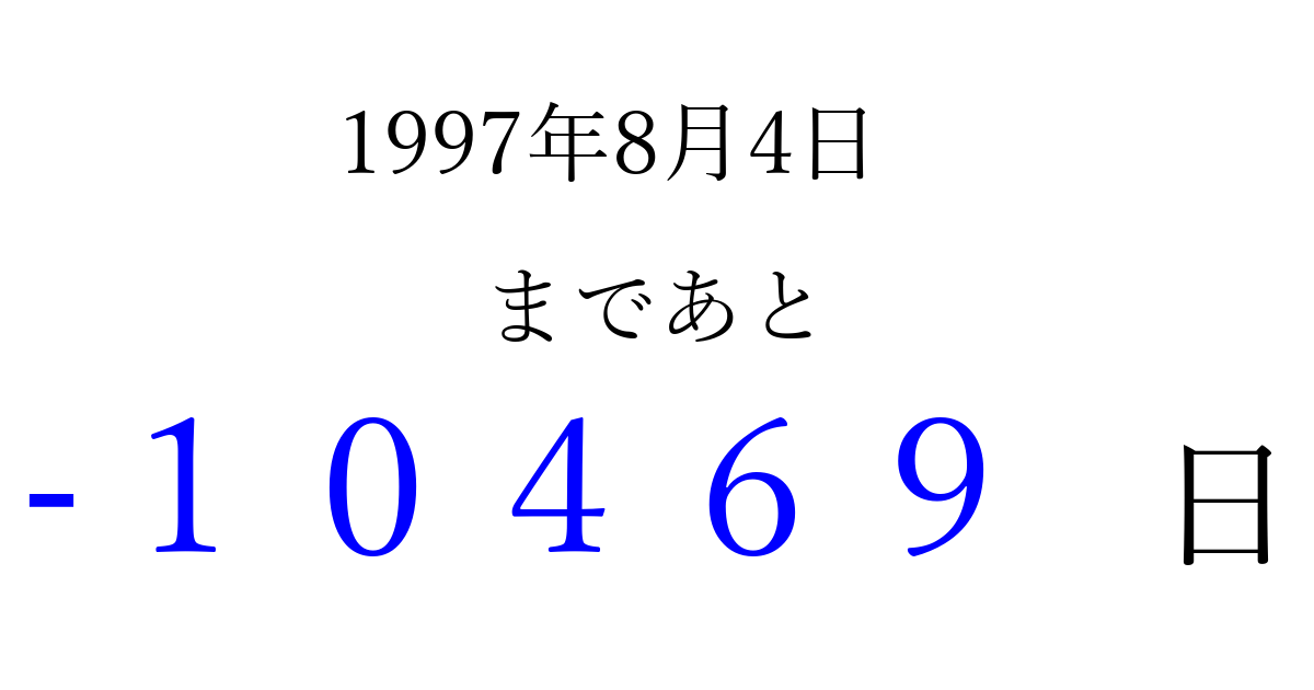 1997年8月4日(月)は もう 00000 日過ぎました 追加すると、トップページからすぐ選べるようになります ※2026/04/03現在の結果です。 最新の状態に更新する ↓シェアして、タイムライン上にカウントダウンを表示しよう!↓ 📤 この結果を共有する Tweet シェア Threads Bluesky 別の日付でカウントダウン 1997年8月のカレンダー このページをブックマークに追加すると、いつでもカウントダウンを確認できます。 (PC: Ctrl+D / Mac: ⌘+D) hitome-notes.comでは以下のページも運営しています。 指定日と期間から日付を計算 | ガチャ確率計算・シミュレーション | プライバシー・ポリシー 運営者:Avocado