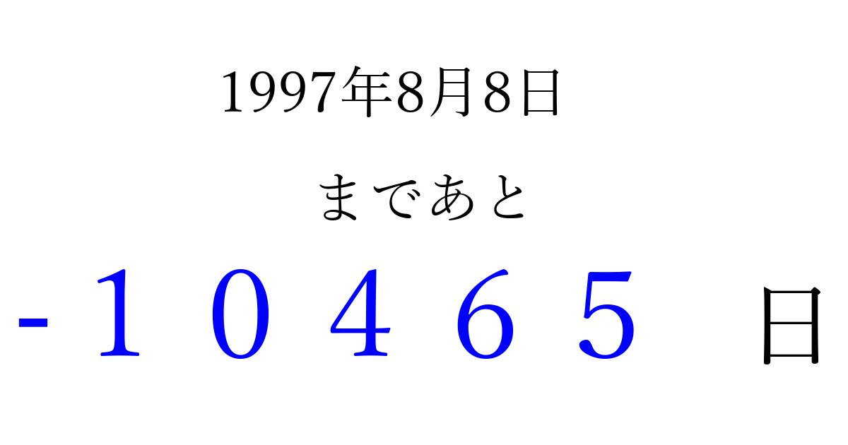 1997年8月8日(金)は もう 00000 日過ぎました 追加すると、トップページからすぐ選べるようになります ※2026/04/03現在の結果です。 最新の状態に更新する ↓シェアして、タイムライン上にカウントダウンを表示しよう!↓ 📤 この結果を共有する Tweet シェア Threads Bluesky 別の日付でカウントダウン 1997年8月のカレンダー このページをブックマークに追加すると、いつでもカウントダウンを確認できます。 (PC: Ctrl+D / Mac: ⌘+D) hitome-notes.comでは以下のページも運営しています。 指定日と期間から日付を計算 | ガチャ確率計算・シミュレーション | プライバシー・ポリシー 運営者:Avocado