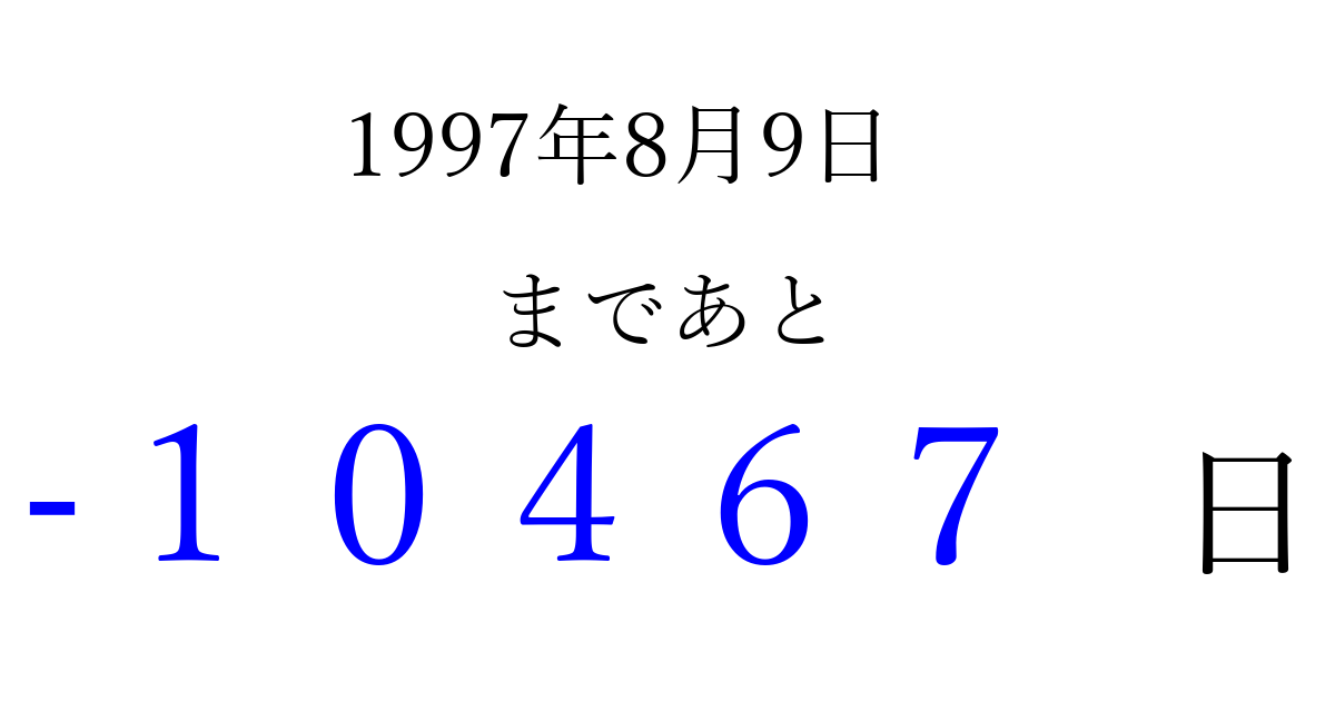 1997年8月9日(土)は もう 00000 日過ぎました 追加すると、トップページからすぐ選べるようになります ※2026/04/06現在の結果です。 最新の状態に更新する ↓シェアして、タイムライン上にカウントダウンを表示しよう!↓ 📤 この結果を共有する Tweet シェア Threads Bluesky 別の日付でカウントダウン 1997年8月のカレンダー このページをブックマークに追加すると、いつでもカウントダウンを確認できます。 (PC: Ctrl+D / Mac: ⌘+D) hitome-notes.comでは以下のページも運営しています。 指定日と期間から日付を計算 | ガチャ確率計算・シミュレーション | プライバシー・ポリシー 運営者:Avocado