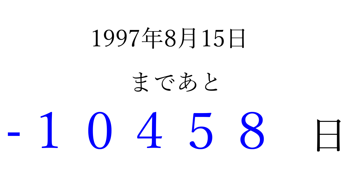 1997年8月15日(金)は もう 00000 日過ぎました 追加すると、トップページからすぐ選べるようになります ※2026/04/03現在の結果です。 最新の状態に更新する ↓シェアして、タイムライン上にカウントダウンを表示しよう!↓ 📤 この結果を共有する Tweet シェア Threads Bluesky 別の日付でカウントダウン 1997年8月のカレンダー このページをブックマークに追加すると、いつでもカウントダウンを確認できます。 (PC: Ctrl+D / Mac: ⌘+D) hitome-notes.comでは以下のページも運営しています。 指定日と期間から日付を計算 | ガチャ確率計算・シミュレーション | プライバシー・ポリシー 運営者:Avocado