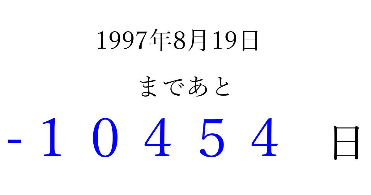 1997年8月19日(火)は もう 00000 日過ぎました 追加すると、トップページからすぐ選べるようになります ※2026/04/03現在の結果です。 最新の状態に更新する ↓シェアして、タイムライン上にカウントダウンを表示しよう!↓ 📤 この結果を共有する Tweet シェア Threads Bluesky 別の日付でカウントダウン 1997年8月のカレンダー このページをブックマークに追加すると、いつでもカウントダウンを確認できます。 (PC: Ctrl+D / Mac: ⌘+D) hitome-notes.comでは以下のページも運営しています。 指定日と期間から日付を計算 | ガチャ確率計算・シミュレーション | プライバシー・ポリシー 運営者:Avocado
