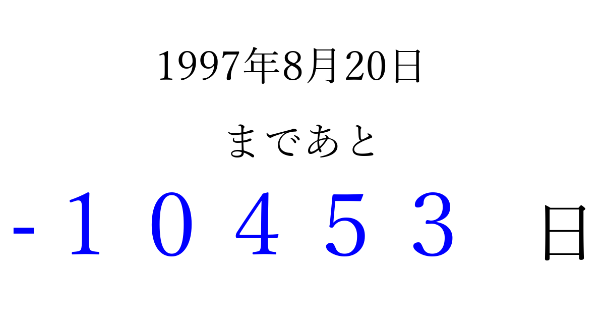 1997年8月20日(水)は もう 00000 日過ぎました 追加すると、トップページからすぐ選べるようになります ※2026/04/03現在の結果です。 最新の状態に更新する ↓シェアして、タイムライン上にカウントダウンを表示しよう!↓ 📤 この結果を共有する Tweet シェア Threads Bluesky 別の日付でカウントダウン 1997年8月のカレンダー このページをブックマークに追加すると、いつでもカウントダウンを確認できます。 (PC: Ctrl+D / Mac: ⌘+D) hitome-notes.comでは以下のページも運営しています。 指定日と期間から日付を計算 | ガチャ確率計算・シミュレーション | プライバシー・ポリシー 運営者:Avocado