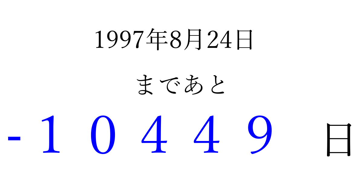1997年8月24日(日)は もう 00000 日過ぎました 追加すると、トップページからすぐ選べるようになります ※2026/04/03現在の結果です。 最新の状態に更新する ↓シェアして、タイムライン上にカウントダウンを表示しよう!↓ 📤 この結果を共有する Tweet シェア Threads Bluesky 別の日付でカウントダウン 1997年8月のカレンダー このページをブックマークに追加すると、いつでもカウントダウンを確認できます。 (PC: Ctrl+D / Mac: ⌘+D) hitome-notes.comでは以下のページも運営しています。 指定日と期間から日付を計算 | ガチャ確率計算・シミュレーション | プライバシー・ポリシー 運営者:Avocado