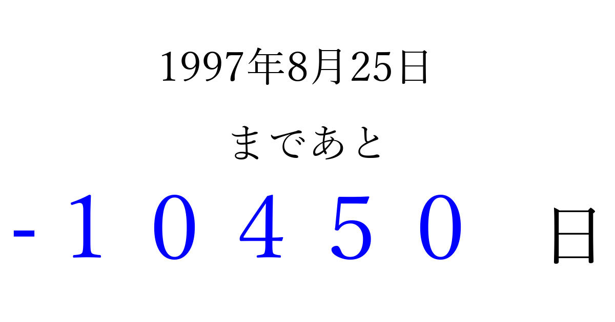 1997年8月25日(月)は もう 00000 日過ぎました 追加すると、トップページからすぐ選べるようになります ※2026/04/05現在の結果です。 最新の状態に更新する ↓シェアして、タイムライン上にカウントダウンを表示しよう!↓ 📤 この結果を共有する Tweet シェア Threads Bluesky 別の日付でカウントダウン 1997年8月のカレンダー このページをブックマークに追加すると、いつでもカウントダウンを確認できます。 (PC: Ctrl+D / Mac: ⌘+D) hitome-notes.comでは以下のページも運営しています。 指定日と期間から日付を計算 | ガチャ確率計算・シミュレーション | プライバシー・ポリシー 運営者:Avocado