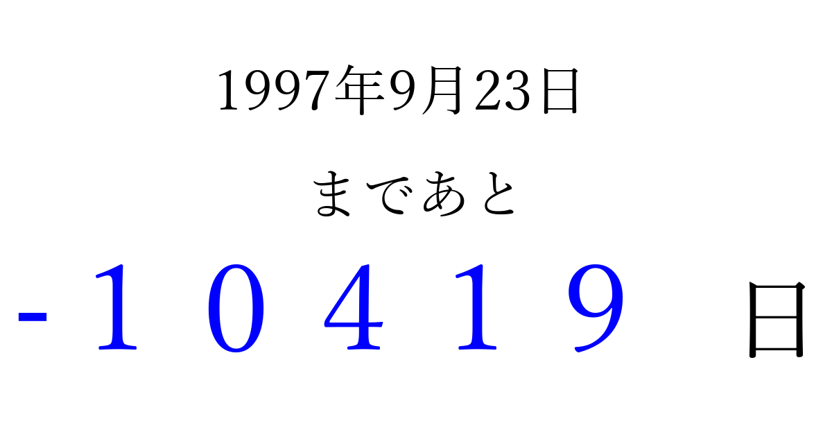 1997年9月23日(火)は もう 00000 日過ぎました 追加すると、トップページからすぐ選べるようになります ※2026/04/03現在の結果です。 最新の状態に更新する ↓シェアして、タイムライン上にカウントダウンを表示しよう!↓ 📤 この結果を共有する Tweet シェア Threads Bluesky 別の日付でカウントダウン 1997年9月のカレンダー このページをブックマークに追加すると、いつでもカウントダウンを確認できます。 (PC: Ctrl+D / Mac: ⌘+D) hitome-notes.comでは以下のページも運営しています。 指定日と期間から日付を計算 | ガチャ確率計算・シミュレーション | プライバシー・ポリシー 運営者:Avocado