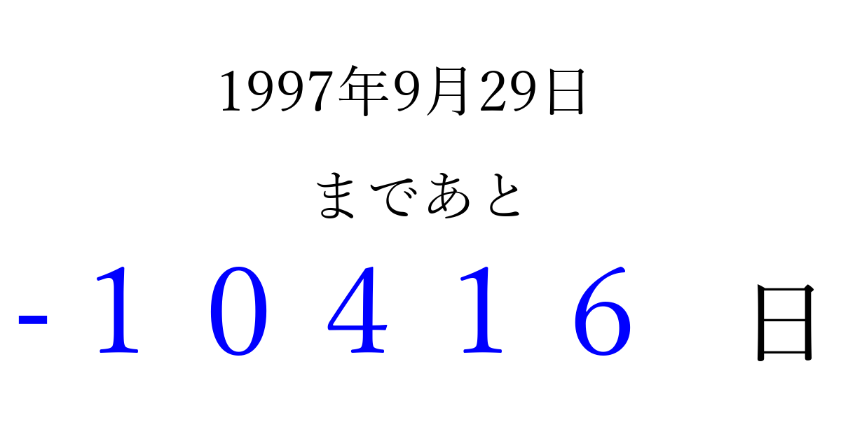 1997年9月29日(月)は もう 00000 日過ぎました 追加すると、トップページからすぐ選べるようになります ※2026/04/06現在の結果です。 最新の状態に更新する ↓シェアして、タイムライン上にカウントダウンを表示しよう!↓ 📤 この結果を共有する Tweet シェア Threads Bluesky 別の日付でカウントダウン 1997年9月のカレンダー このページをブックマークに追加すると、いつでもカウントダウンを確認できます。 (PC: Ctrl+D / Mac: ⌘+D) hitome-notes.comでは以下のページも運営しています。 指定日と期間から日付を計算 | ガチャ確率計算・シミュレーション | プライバシー・ポリシー 運営者:Avocado