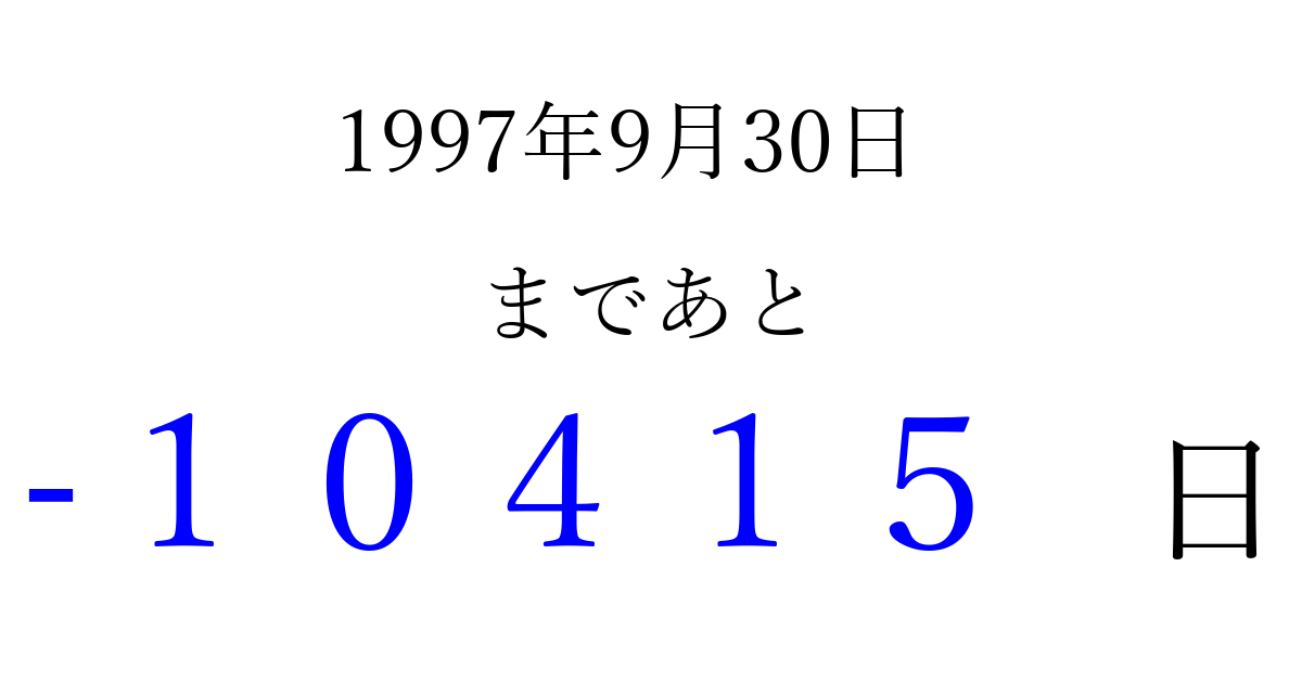 1997年9月30日(火)は もう 00000 日過ぎました 追加すると、トップページからすぐ選べるようになります ※2026/04/06現在の結果です。 最新の状態に更新する ↓シェアして、タイムライン上にカウントダウンを表示しよう!↓ 📤 この結果を共有する Tweet シェア Threads Bluesky 別の日付でカウントダウン 1997年9月のカレンダー このページをブックマークに追加すると、いつでもカウントダウンを確認できます。 (PC: Ctrl+D / Mac: ⌘+D) hitome-notes.comでは以下のページも運営しています。 指定日と期間から日付を計算 | ガチャ確率計算・シミュレーション | プライバシー・ポリシー 運営者:Avocado