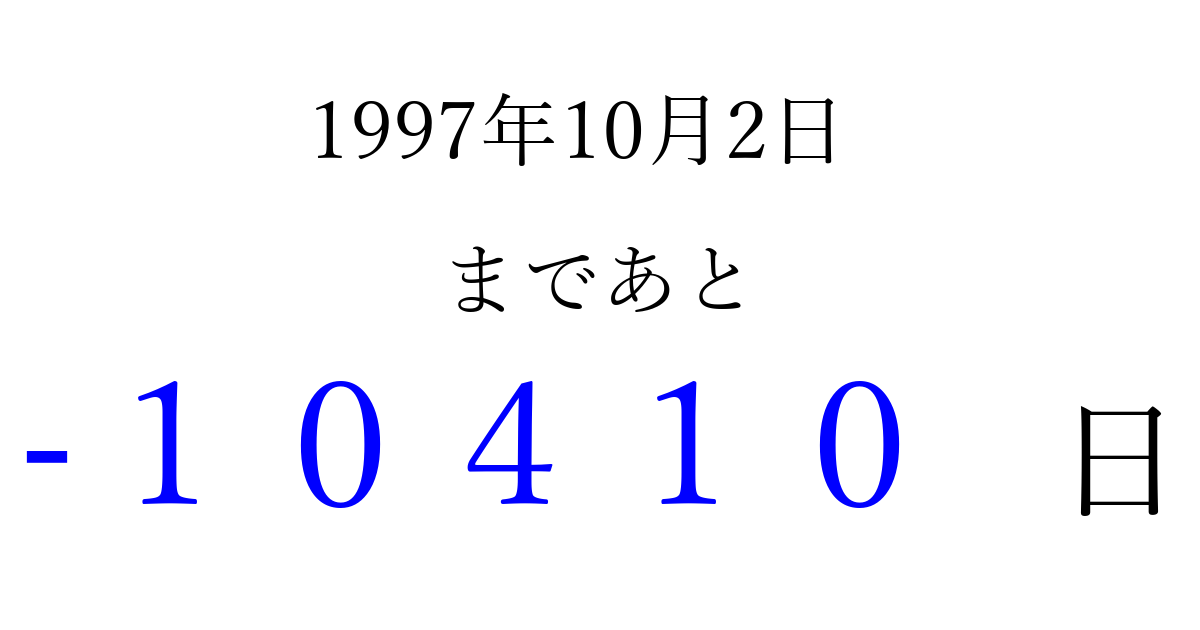 1997年10月2日(木)は もう 00000 日過ぎました 追加すると、トップページからすぐ選べるようになります ※2026/04/03現在の結果です。 最新の状態に更新する ↓シェアして、タイムライン上にカウントダウンを表示しよう!↓ 📤 この結果を共有する Tweet シェア Threads Bluesky 別の日付でカウントダウン 1997年10月のカレンダー このページをブックマークに追加すると、いつでもカウントダウンを確認できます。 (PC: Ctrl+D / Mac: ⌘+D) hitome-notes.comでは以下のページも運営しています。 指定日と期間から日付を計算 | ガチャ確率計算・シミュレーション | プライバシー・ポリシー 運営者:Avocado