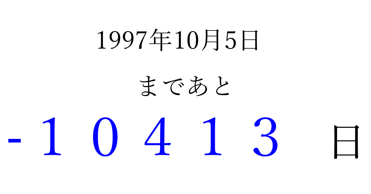 1997年10月5日(日)は もう 00000 日過ぎました 追加すると、トップページからすぐ選べるようになります ※2026/04/09現在の結果です。 最新の状態に更新する ↓シェアして、タイムライン上にカウントダウンを表示しよう!↓ 📤 この結果を共有する Tweet シェア Threads Bluesky 別の日付でカウントダウン 1997年10月のカレンダー このページをブックマークに追加すると、いつでもカウントダウンを確認できます。 (PC: Ctrl+D / Mac: ⌘+D) hitome-notes.comでは以下のページも運営しています。 指定日と期間から日付を計算 | ガチャ確率計算・シミュレーション | プライバシー・ポリシー 運営者:Avocado