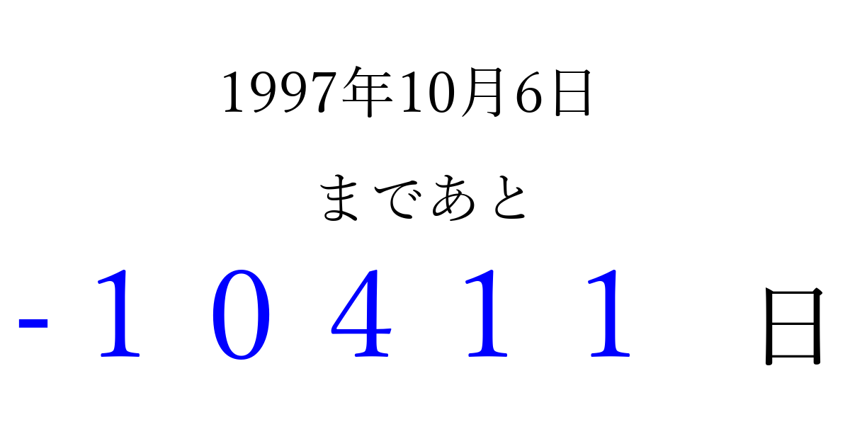 1997年10月6日(月)は もう 00000 日過ぎました 追加すると、トップページからすぐ選べるようになります ※2026/04/08現在の結果です。 最新の状態に更新する ↓シェアして、タイムライン上にカウントダウンを表示しよう!↓ 📤 この結果を共有する Tweet シェア Threads Bluesky 別の日付でカウントダウン 1997年10月のカレンダー このページをブックマークに追加すると、いつでもカウントダウンを確認できます。 (PC: Ctrl+D / Mac: ⌘+D) hitome-notes.comでは以下のページも運営しています。 指定日と期間から日付を計算 | ガチャ確率計算・シミュレーション | プライバシー・ポリシー 運営者:Avocado