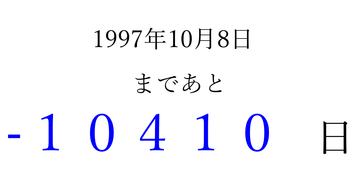 1997年10月8日(水)は もう 00000 日過ぎました 追加すると、トップページからすぐ選べるようになります ※2026/04/09現在の結果です。 最新の状態に更新する ↓シェアして、タイムライン上にカウントダウンを表示しよう!↓ 📤 この結果を共有する Tweet シェア Threads Bluesky 別の日付でカウントダウン 1997年10月のカレンダー このページをブックマークに追加すると、いつでもカウントダウンを確認できます。 (PC: Ctrl+D / Mac: ⌘+D) hitome-notes.comでは以下のページも運営しています。 指定日と期間から日付を計算 | ガチャ確率計算・シミュレーション | プライバシー・ポリシー 運営者:Avocado