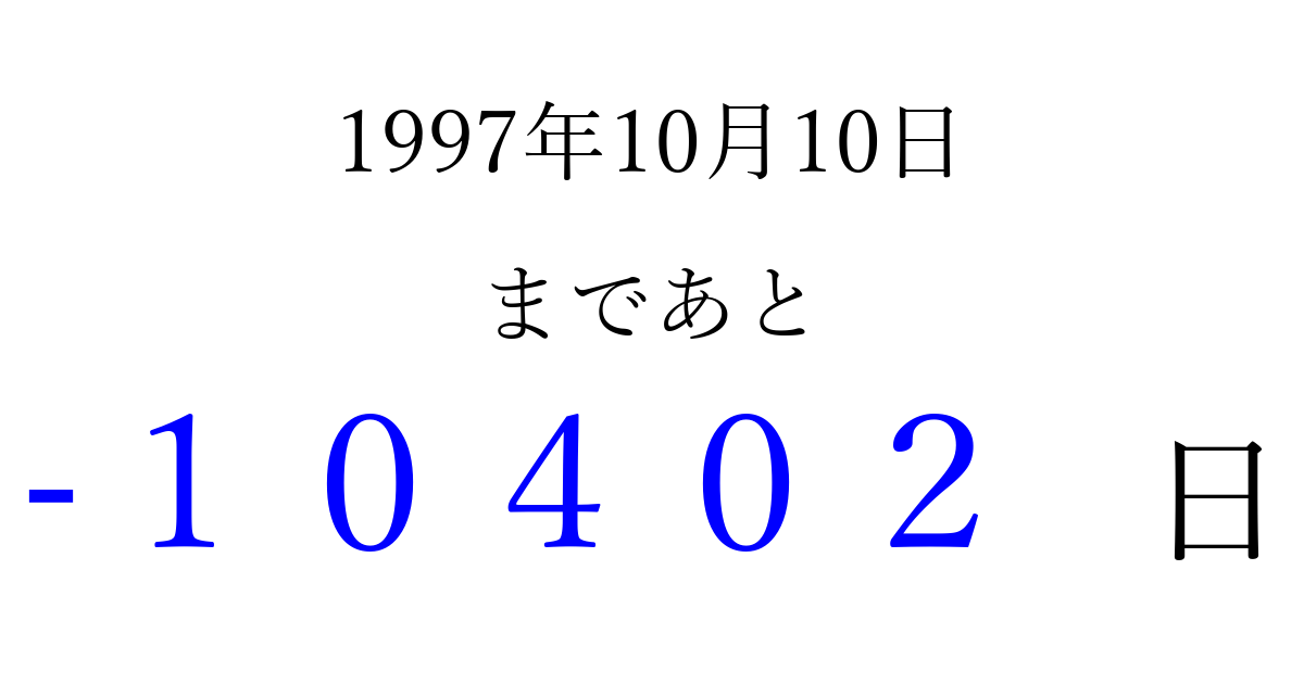 1997年10月10日(金)は もう 00000 日過ぎました 追加すると、トップページからすぐ選べるようになります ※2026/04/03現在の結果です。 最新の状態に更新する ↓シェアして、タイムライン上にカウントダウンを表示しよう!↓ 📤 この結果を共有する Tweet シェア Threads Bluesky 別の日付でカウントダウン 1997年10月のカレンダー このページをブックマークに追加すると、いつでもカウントダウンを確認できます。 (PC: Ctrl+D / Mac: ⌘+D) hitome-notes.comでは以下のページも運営しています。 指定日と期間から日付を計算 | ガチャ確率計算・シミュレーション | プライバシー・ポリシー 運営者:Avocado