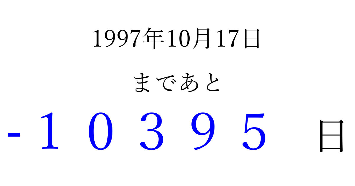 1997年10月17日(金)は もう 00000 日過ぎました 追加すると、トップページからすぐ選べるようになります ※2026/04/03現在の結果です。 最新の状態に更新する ↓シェアして、タイムライン上にカウントダウンを表示しよう!↓ 📤 この結果を共有する Tweet シェア Threads Bluesky 別の日付でカウントダウン 1997年10月のカレンダー このページをブックマークに追加すると、いつでもカウントダウンを確認できます。 (PC: Ctrl+D / Mac: ⌘+D) hitome-notes.comでは以下のページも運営しています。 指定日と期間から日付を計算 | ガチャ確率計算・シミュレーション | プライバシー・ポリシー 運営者:Avocado