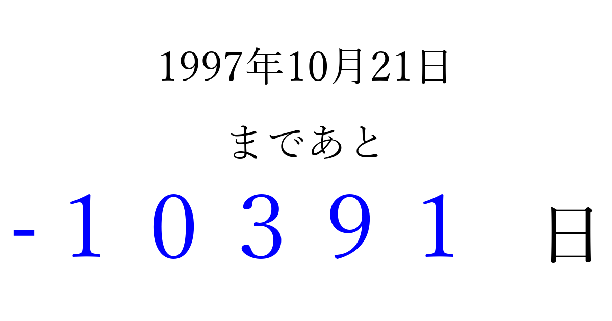 1997年10月21日(火)は もう 00000 日過ぎました 追加すると、トップページからすぐ選べるようになります ※2026/04/03現在の結果です。 最新の状態に更新する ↓シェアして、タイムライン上にカウントダウンを表示しよう!↓ 📤 この結果を共有する Tweet シェア Threads Bluesky 別の日付でカウントダウン 1997年10月のカレンダー このページをブックマークに追加すると、いつでもカウントダウンを確認できます。 (PC: Ctrl+D / Mac: ⌘+D) hitome-notes.comでは以下のページも運営しています。 指定日と期間から日付を計算 | ガチャ確率計算・シミュレーション | プライバシー・ポリシー 運営者:Avocado