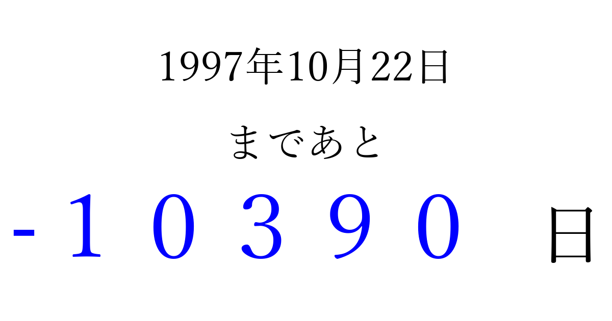 1997年10月22日(水)は もう 00000 日過ぎました 追加すると、トップページからすぐ選べるようになります ※2026/04/03現在の結果です。 最新の状態に更新する ↓シェアして、タイムライン上にカウントダウンを表示しよう!↓ 📤 この結果を共有する Tweet シェア Threads Bluesky 別の日付でカウントダウン 1997年10月のカレンダー このページをブックマークに追加すると、いつでもカウントダウンを確認できます。 (PC: Ctrl+D / Mac: ⌘+D) hitome-notes.comでは以下のページも運営しています。 指定日と期間から日付を計算 | ガチャ確率計算・シミュレーション | プライバシー・ポリシー 運営者:Avocado