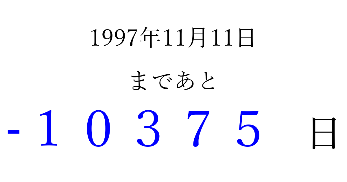 1997年11月11日(火)は もう 00000 日過ぎました 追加すると、トップページからすぐ選べるようになります ※2026/04/08現在の結果です。 最新の状態に更新する ↓シェアして、タイムライン上にカウントダウンを表示しよう!↓ 📤 この結果を共有する Tweet シェア Threads Bluesky 別の日付でカウントダウン 1997年11月のカレンダー このページをブックマークに追加すると、いつでもカウントダウンを確認できます。 (PC: Ctrl+D / Mac: ⌘+D) hitome-notes.comでは以下のページも運営しています。 指定日と期間から日付を計算 | ガチャ確率計算・シミュレーション | プライバシー・ポリシー 運営者:Avocado