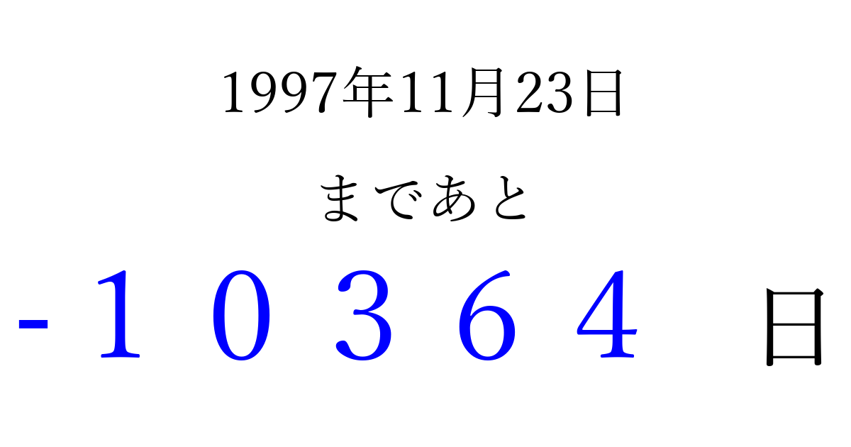 1997年11月23日(日)は もう 00000 日過ぎました 追加すると、トップページからすぐ選べるようになります ※2026/04/09現在の結果です。 最新の状態に更新する ↓シェアして、タイムライン上にカウントダウンを表示しよう!↓ 📤 この結果を共有する Tweet シェア Threads Bluesky 別の日付でカウントダウン 1997年11月のカレンダー このページをブックマークに追加すると、いつでもカウントダウンを確認できます。 (PC: Ctrl+D / Mac: ⌘+D) hitome-notes.comでは以下のページも運営しています。 指定日と期間から日付を計算 | ガチャ確率計算・シミュレーション | プライバシー・ポリシー 運営者:Avocado