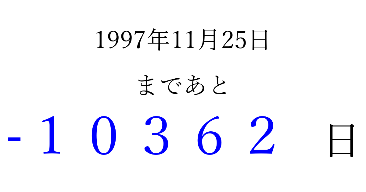 1997年11月25日(火)は もう 00000 日過ぎました 追加すると、トップページからすぐ選べるようになります ※2026/04/09現在の結果です。 最新の状態に更新する ↓シェアして、タイムライン上にカウントダウンを表示しよう!↓ 📤 この結果を共有する Tweet シェア Threads Bluesky 別の日付でカウントダウン 1997年11月のカレンダー このページをブックマークに追加すると、いつでもカウントダウンを確認できます。 (PC: Ctrl+D / Mac: ⌘+D) hitome-notes.comでは以下のページも運営しています。 指定日と期間から日付を計算 | ガチャ確率計算・シミュレーション | プライバシー・ポリシー 運営者:Avocado