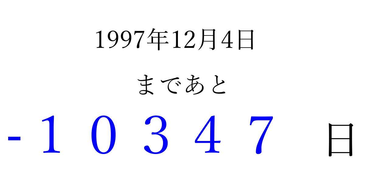 1997年12月4日(木)は もう 00000 日過ぎました 追加すると、トップページからすぐ選べるようになります ※2026/04/03現在の結果です。 最新の状態に更新する ↓シェアして、タイムライン上にカウントダウンを表示しよう!↓ 📤 この結果を共有する Tweet シェア Threads Bluesky 別の日付でカウントダウン 1997年12月のカレンダー このページをブックマークに追加すると、いつでもカウントダウンを確認できます。 (PC: Ctrl+D / Mac: ⌘+D) hitome-notes.comでは以下のページも運営しています。 指定日と期間から日付を計算 | ガチャ確率計算・シミュレーション | プライバシー・ポリシー 運営者:Avocado