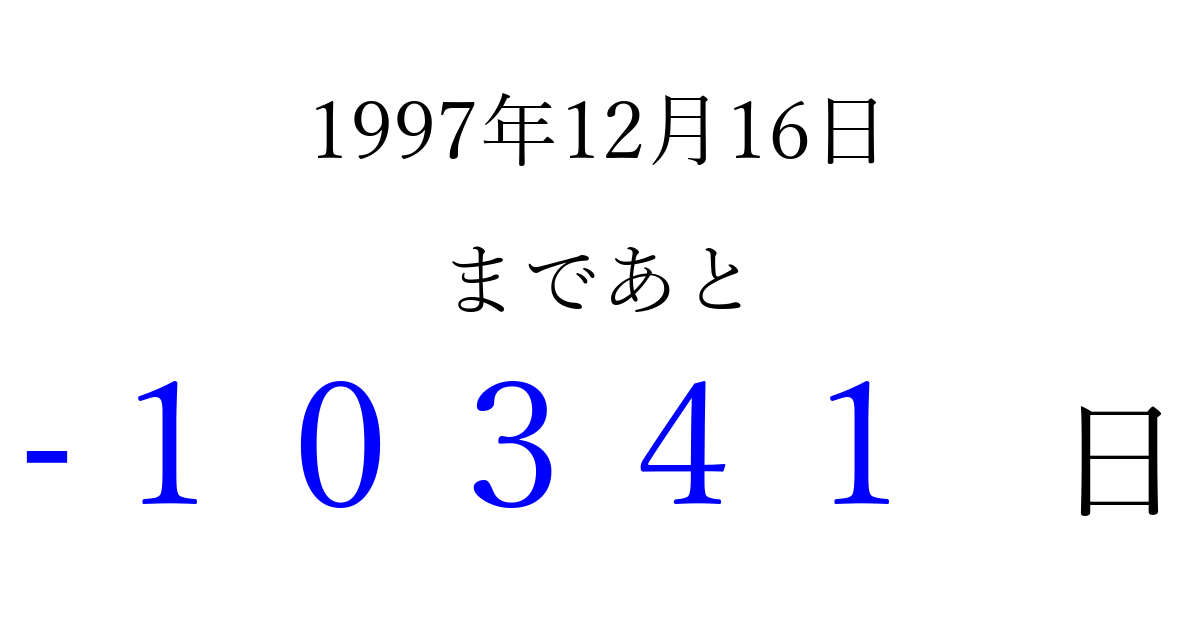 1997年12月16日(火)は もう 00000 日過ぎました 追加すると、トップページからすぐ選べるようになります ※2026/04/09現在の結果です。 最新の状態に更新する ↓シェアして、タイムライン上にカウントダウンを表示しよう!↓ 📤 この結果を共有する Tweet シェア Threads Bluesky 別の日付でカウントダウン 1997年12月のカレンダー このページをブックマークに追加すると、いつでもカウントダウンを確認できます。 (PC: Ctrl+D / Mac: ⌘+D) hitome-notes.comでは以下のページも運営しています。 指定日と期間から日付を計算 | ガチャ確率計算・シミュレーション | プライバシー・ポリシー 運営者:Avocado