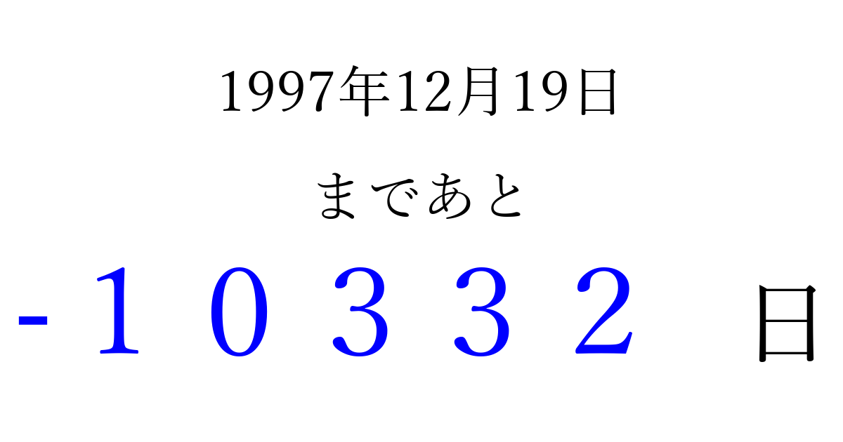 1997年12月19日(金)は もう 00000 日過ぎました 追加すると、トップページからすぐ選べるようになります ※2026/04/03現在の結果です。 最新の状態に更新する ↓シェアして、タイムライン上にカウントダウンを表示しよう!↓ 📤 この結果を共有する Tweet シェア Threads Bluesky 別の日付でカウントダウン 1997年12月のカレンダー このページをブックマークに追加すると、いつでもカウントダウンを確認できます。 (PC: Ctrl+D / Mac: ⌘+D) hitome-notes.comでは以下のページも運営しています。 指定日と期間から日付を計算 | ガチャ確率計算・シミュレーション | プライバシー・ポリシー 運営者:Avocado