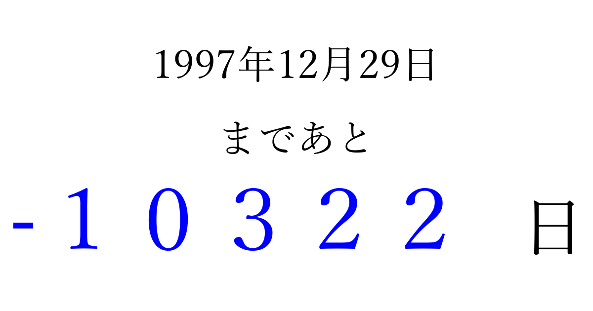 1997年12月29日(月)は もう 00000 日過ぎました 追加すると、トップページからすぐ選べるようになります ※2026/04/03現在の結果です。 最新の状態に更新する ↓シェアして、タイムライン上にカウントダウンを表示しよう!↓ 📤 この結果を共有する Tweet シェア Threads Bluesky 別の日付でカウントダウン 1997年12月のカレンダー このページをブックマークに追加すると、いつでもカウントダウンを確認できます。 (PC: Ctrl+D / Mac: ⌘+D) hitome-notes.comでは以下のページも運営しています。 指定日と期間から日付を計算 | ガチャ確率計算・シミュレーション | プライバシー・ポリシー 運営者:Avocado