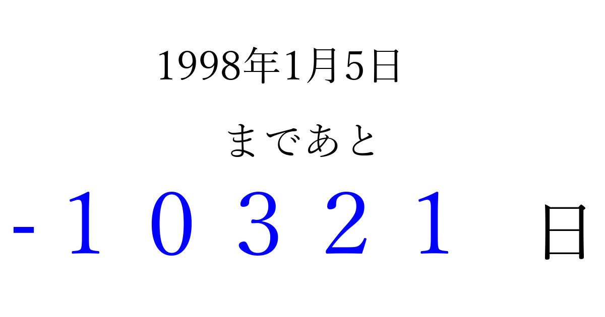 1998年1月5日(月)は もう 00000 日過ぎました 追加すると、トップページからすぐ選べるようになります ※2026/04/09現在の結果です。 最新の状態に更新する ↓シェアして、タイムライン上にカウントダウンを表示しよう!↓ 📤 この結果を共有する Tweet シェア Threads Bluesky 別の日付でカウントダウン 1998年1月のカレンダー このページをブックマークに追加すると、いつでもカウントダウンを確認できます。 (PC: Ctrl+D / Mac: ⌘+D) hitome-notes.comでは以下のページも運営しています。 指定日と期間から日付を計算 | ガチャ確率計算・シミュレーション | プライバシー・ポリシー 運営者:Avocado