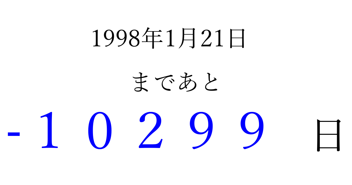 1998年1月21日(水)は もう 00000 日過ぎました 追加すると、トップページからすぐ選べるようになります ※2026/04/03現在の結果です。 最新の状態に更新する ↓シェアして、タイムライン上にカウントダウンを表示しよう!↓ 📤 この結果を共有する Tweet シェア Threads Bluesky 別の日付でカウントダウン 1998年1月のカレンダー このページをブックマークに追加すると、いつでもカウントダウンを確認できます。 (PC: Ctrl+D / Mac: ⌘+D) hitome-notes.comでは以下のページも運営しています。 指定日と期間から日付を計算 | ガチャ確率計算・シミュレーション | プライバシー・ポリシー 運営者:Avocado