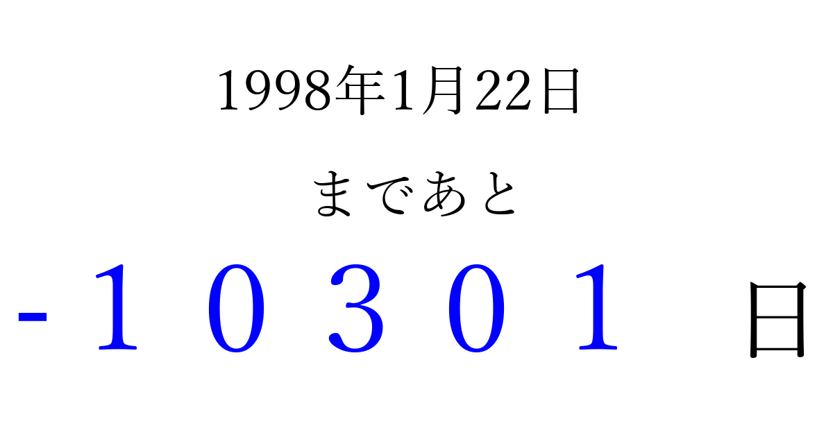 1998年1月22日(木)は もう 00000 日過ぎました 追加すると、トップページからすぐ選べるようになります ※2026/04/06現在の結果です。 最新の状態に更新する ↓シェアして、タイムライン上にカウントダウンを表示しよう!↓ 📤 この結果を共有する Tweet シェア Threads Bluesky 別の日付でカウントダウン 1998年1月のカレンダー このページをブックマークに追加すると、いつでもカウントダウンを確認できます。 (PC: Ctrl+D / Mac: ⌘+D) hitome-notes.comでは以下のページも運営しています。 指定日と期間から日付を計算 | ガチャ確率計算・シミュレーション | プライバシー・ポリシー 運営者:Avocado