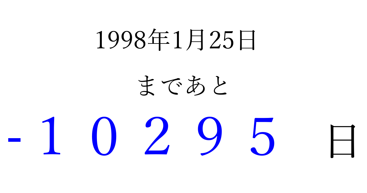 1998年1月25日(日)は もう 00000 日過ぎました 追加すると、トップページからすぐ選べるようになります ※2026/04/03現在の結果です。 最新の状態に更新する ↓シェアして、タイムライン上にカウントダウンを表示しよう!↓ 📤 この結果を共有する Tweet シェア Threads Bluesky 別の日付でカウントダウン 1998年1月のカレンダー このページをブックマークに追加すると、いつでもカウントダウンを確認できます。 (PC: Ctrl+D / Mac: ⌘+D) hitome-notes.comでは以下のページも運営しています。 指定日と期間から日付を計算 | ガチャ確率計算・シミュレーション | プライバシー・ポリシー 運営者:Avocado