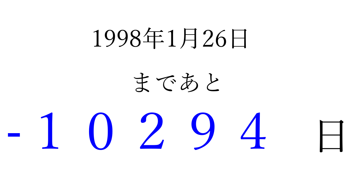 1998年1月26日(月)は もう 00000 日過ぎました 追加すると、トップページからすぐ選べるようになります ※2026/04/03現在の結果です。 最新の状態に更新する ↓シェアして、タイムライン上にカウントダウンを表示しよう!↓ 📤 この結果を共有する Tweet シェア Threads Bluesky 別の日付でカウントダウン 1998年1月のカレンダー このページをブックマークに追加すると、いつでもカウントダウンを確認できます。 (PC: Ctrl+D / Mac: ⌘+D) hitome-notes.comでは以下のページも運営しています。 指定日と期間から日付を計算 | ガチャ確率計算・シミュレーション | プライバシー・ポリシー 運営者:Avocado