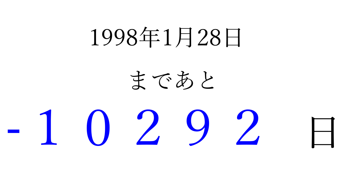 1998年1月28日(水)は もう 00000 日過ぎました 追加すると、トップページからすぐ選べるようになります ※2026/04/03現在の結果です。 最新の状態に更新する ↓シェアして、タイムライン上にカウントダウンを表示しよう!↓ 📤 この結果を共有する Tweet シェア Threads Bluesky 別の日付でカウントダウン 1998年1月のカレンダー このページをブックマークに追加すると、いつでもカウントダウンを確認できます。 (PC: Ctrl+D / Mac: ⌘+D) hitome-notes.comでは以下のページも運営しています。 指定日と期間から日付を計算 | ガチャ確率計算・シミュレーション | プライバシー・ポリシー 運営者:Avocado