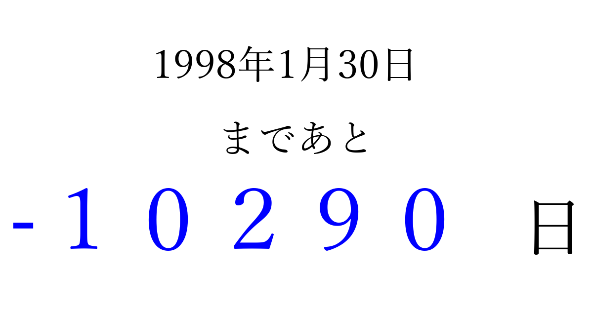 1998年1月30日(金)は もう 00000 日過ぎました 追加すると、トップページからすぐ選べるようになります ※2026/04/03現在の結果です。 最新の状態に更新する ↓シェアして、タイムライン上にカウントダウンを表示しよう!↓ 📤 この結果を共有する Tweet シェア Threads Bluesky 別の日付でカウントダウン 1998年1月のカレンダー このページをブックマークに追加すると、いつでもカウントダウンを確認できます。 (PC: Ctrl+D / Mac: ⌘+D) hitome-notes.comでは以下のページも運営しています。 指定日と期間から日付を計算 | ガチャ確率計算・シミュレーション | プライバシー・ポリシー 運営者:Avocado