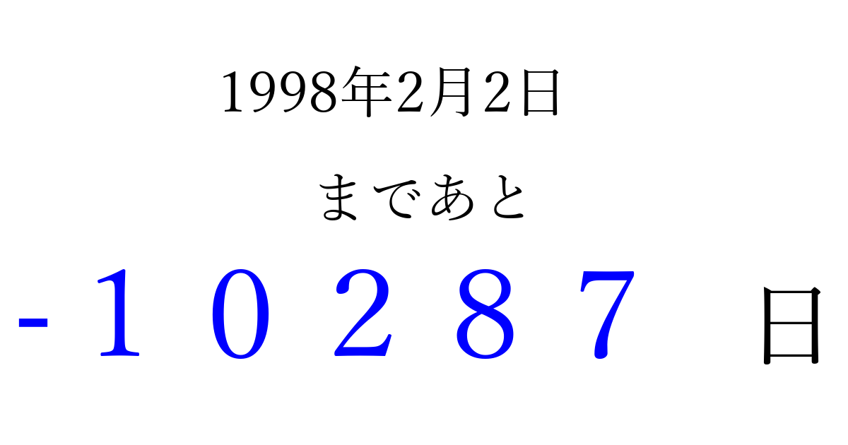 1998年2月2日(月)は もう 00000 日過ぎました 追加すると、トップページからすぐ選べるようになります ※2026/04/03現在の結果です。 最新の状態に更新する ↓シェアして、タイムライン上にカウントダウンを表示しよう!↓ 📤 この結果を共有する Tweet シェア Threads Bluesky 別の日付でカウントダウン 1998年2月のカレンダー このページをブックマークに追加すると、いつでもカウントダウンを確認できます。 (PC: Ctrl+D / Mac: ⌘+D) hitome-notes.comでは以下のページも運営しています。 指定日と期間から日付を計算 | ガチャ確率計算・シミュレーション | プライバシー・ポリシー 運営者:Avocado