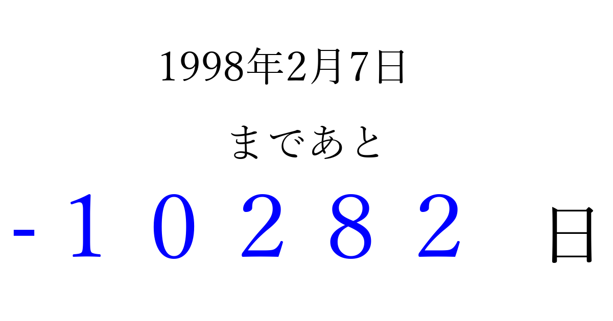 1998年2月7日(土)は もう 00000 日過ぎました 追加すると、トップページからすぐ選べるようになります ※2026/04/03現在の結果です。 最新の状態に更新する ↓シェアして、タイムライン上にカウントダウンを表示しよう!↓ 📤 この結果を共有する Tweet シェア Threads Bluesky 別の日付でカウントダウン 1998年2月のカレンダー このページをブックマークに追加すると、いつでもカウントダウンを確認できます。 (PC: Ctrl+D / Mac: ⌘+D) hitome-notes.comでは以下のページも運営しています。 指定日と期間から日付を計算 | ガチャ確率計算・シミュレーション | プライバシー・ポリシー 運営者:Avocado
