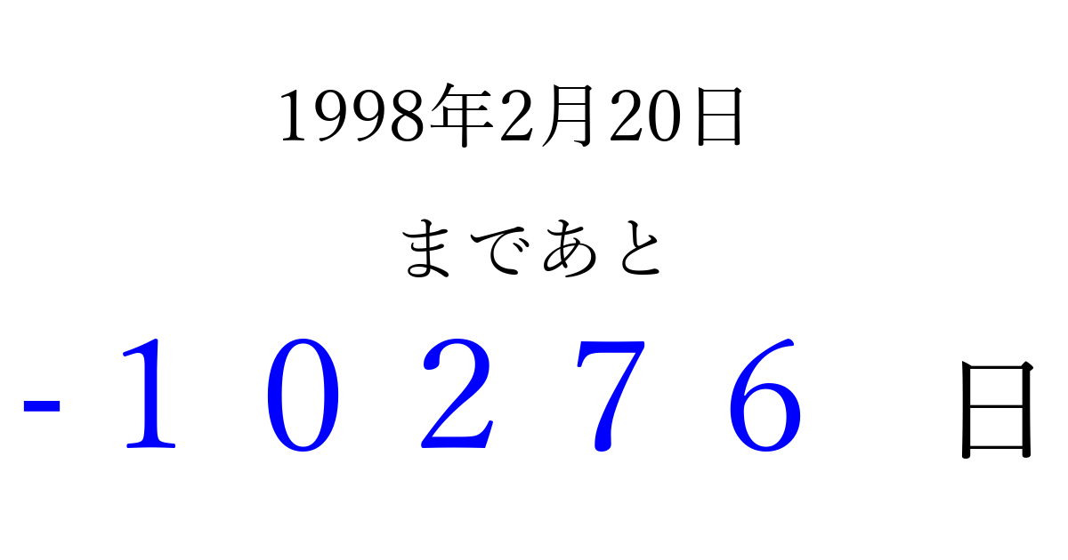 1998年2月20日(金)は もう 00000 日過ぎました 追加すると、トップページからすぐ選べるようになります ※2026/04/10現在の結果です。 最新の状態に更新する ↓シェアして、タイムライン上にカウントダウンを表示しよう!↓ 📤 この結果を共有する Tweet シェア Threads Bluesky 別の日付でカウントダウン 1998年2月のカレンダー このページをブックマークに追加すると、いつでもカウントダウンを確認できます。 (PC: Ctrl+D / Mac: ⌘+D) hitome-notes.comでは以下のページも運営しています。 指定日と期間から日付を計算 | ガチャ確率計算・シミュレーション | プライバシー・ポリシー 運営者:Avocado