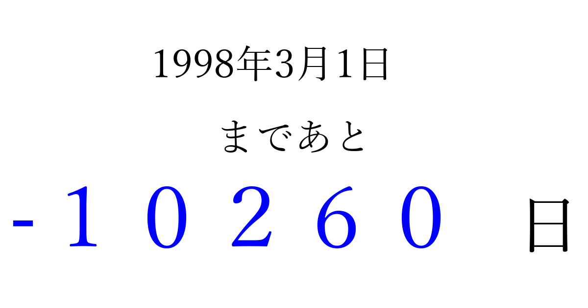 1998年3月1日(日)は もう 00000 日過ぎました 追加すると、トップページからすぐ選べるようになります ※2026/04/03現在の結果です。 最新の状態に更新する ↓シェアして、タイムライン上にカウントダウンを表示しよう!↓ 📤 この結果を共有する Tweet シェア Threads Bluesky 別の日付でカウントダウン 1998年3月のカレンダー このページをブックマークに追加すると、いつでもカウントダウンを確認できます。 (PC: Ctrl+D / Mac: ⌘+D) hitome-notes.comでは以下のページも運営しています。 指定日と期間から日付を計算 | ガチャ確率計算・シミュレーション | プライバシー・ポリシー 運営者:Avocado