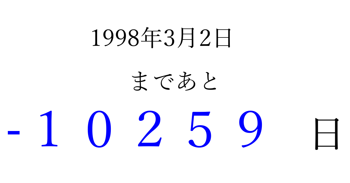 1998年3月2日(月)は もう 00000 日過ぎました 追加すると、トップページからすぐ選べるようになります ※2026/04/03現在の結果です。 最新の状態に更新する ↓シェアして、タイムライン上にカウントダウンを表示しよう!↓ 📤 この結果を共有する Tweet シェア Threads Bluesky 別の日付でカウントダウン 1998年3月のカレンダー このページをブックマークに追加すると、いつでもカウントダウンを確認できます。 (PC: Ctrl+D / Mac: ⌘+D) hitome-notes.comでは以下のページも運営しています。 指定日と期間から日付を計算 | ガチャ確率計算・シミュレーション | プライバシー・ポリシー 運営者:Avocado