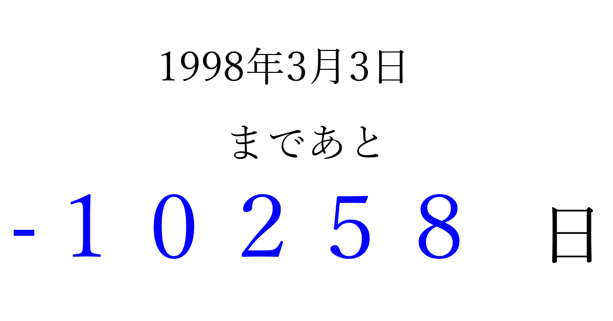 1998年3月3日(火)は もう 00000 日過ぎました 追加すると、トップページからすぐ選べるようになります ※2026/04/03現在の結果です。 最新の状態に更新する ↓シェアして、タイムライン上にカウントダウンを表示しよう!↓ 📤 この結果を共有する Tweet シェア Threads Bluesky 別の日付でカウントダウン 1998年3月のカレンダー このページをブックマークに追加すると、いつでもカウントダウンを確認できます。 (PC: Ctrl+D / Mac: ⌘+D) hitome-notes.comでは以下のページも運営しています。 指定日と期間から日付を計算 | ガチャ確率計算・シミュレーション | プライバシー・ポリシー 運営者:Avocado
