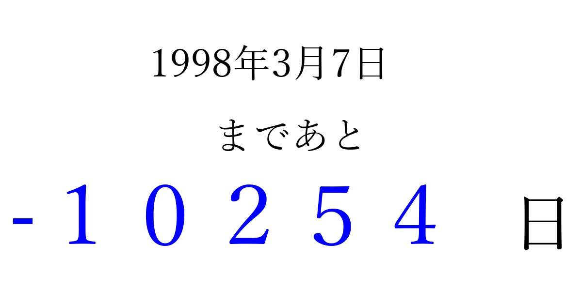 1998年3月7日(土)は もう 00000 日過ぎました 追加すると、トップページからすぐ選べるようになります ※2026/04/03現在の結果です。 最新の状態に更新する ↓シェアして、タイムライン上にカウントダウンを表示しよう!↓ 📤 この結果を共有する Tweet シェア Threads Bluesky 別の日付でカウントダウン 1998年3月のカレンダー このページをブックマークに追加すると、いつでもカウントダウンを確認できます。 (PC: Ctrl+D / Mac: ⌘+D) hitome-notes.comでは以下のページも運営しています。 指定日と期間から日付を計算 | ガチャ確率計算・シミュレーション | プライバシー・ポリシー 運営者:Avocado